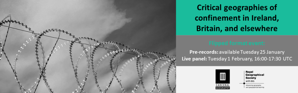 Critical geographies of confinement in Ireland, Britain, and elsewhere is a flipped format event, with pre-recorded presentations available online, followed by a live panel discussion:
