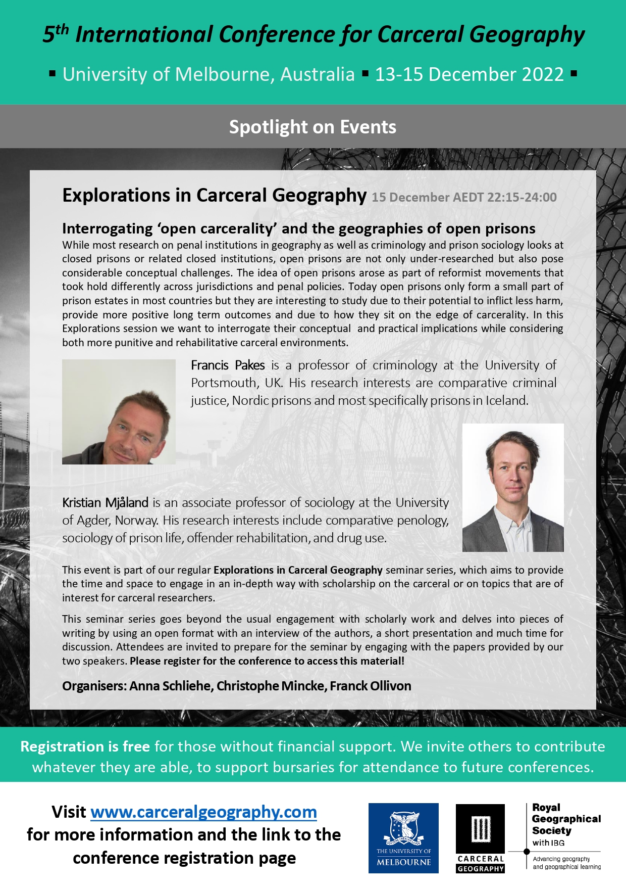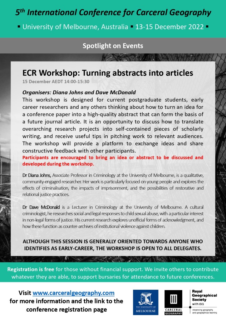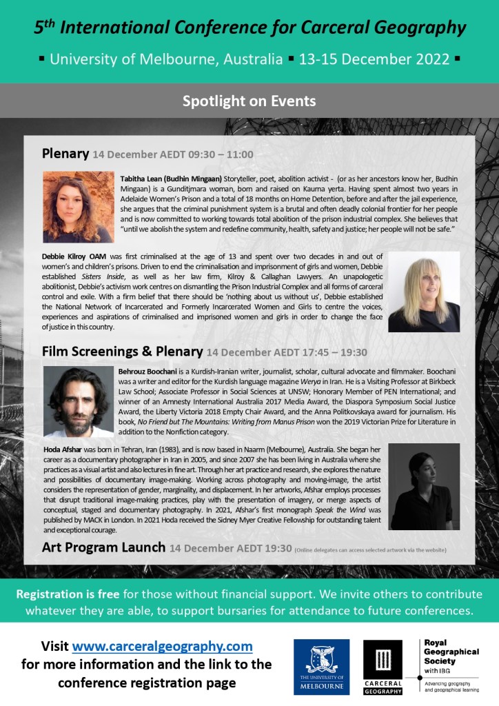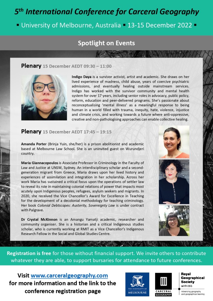 Registration is now open for the 5th International Conference for Carceral Geography, a hybrid conference (in-person and online) in Melbourne, Australia on 13-15th December 2022!
